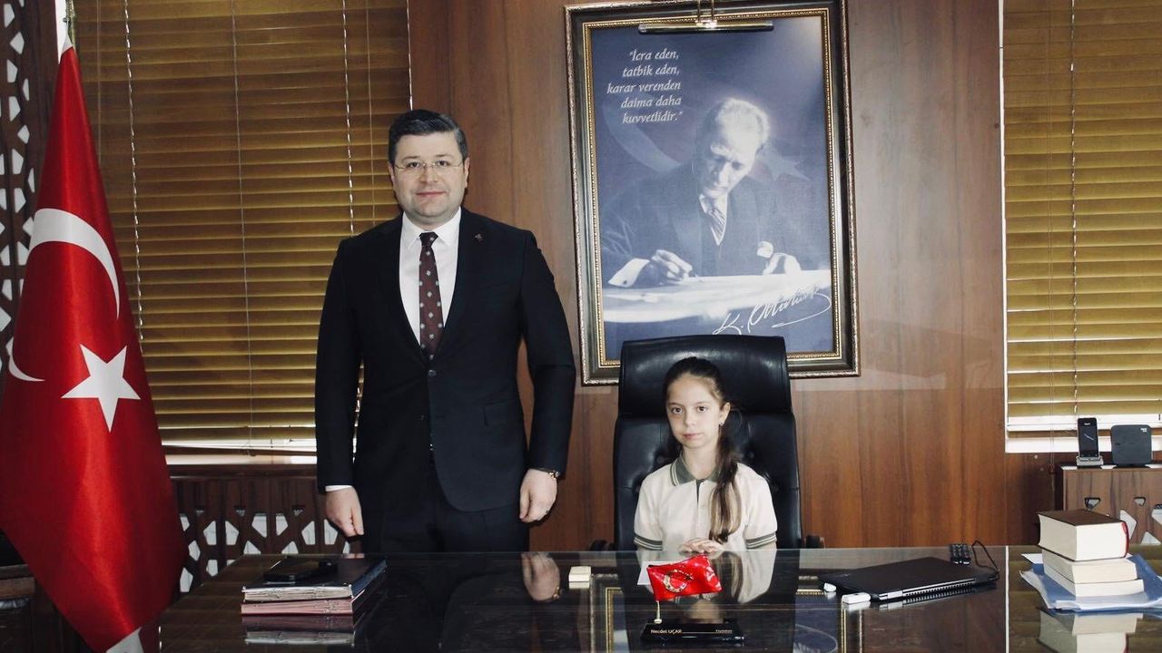 Kaymakam Necdet Uçar makamını Mehmet Bülent Özyürük İlkokulu 4. sınıfı öğrencileri Hatice Hazel Bozardıç ve Mert Terzi' ye verdi.